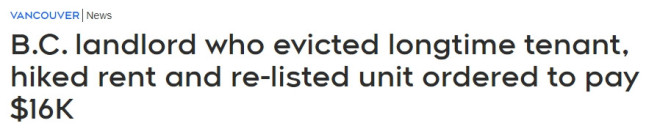 加拿大卑诗省下陆平原一位华人房东因为驱逐一位长期租客,并在几个月后以更高的租金出租同一套房,被判赔偿该租客16,480加元。