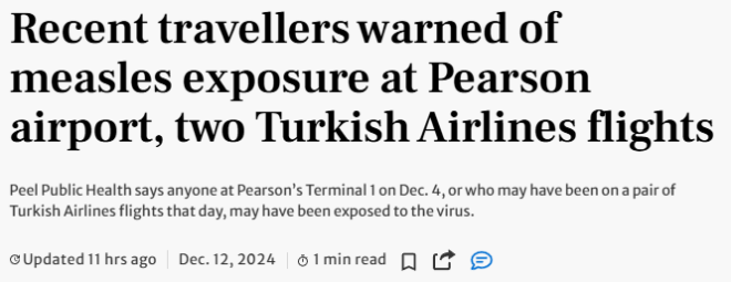 皮尔区公共卫生局(Peel Public Health,PPH)提醒近期旅行的旅客,他们有可能在多伦多皮尔逊机场以及土耳其航空公司(Turkish Airlines)的两架航班上接触过麻疹病毒。