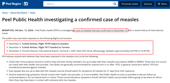 PPH表示,12月4日搭乘土耳其航空TK707航班从喀布尔飞往伊斯坦布尔,以及同一天搭乘TK17航班从伊斯坦布尔飞往多伦多的所有乘客,都可能接触过麻疹病毒。