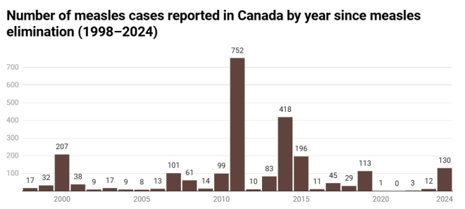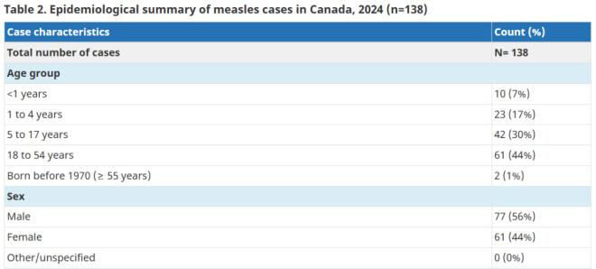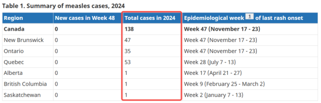 2024年迄今为止,加拿大全国报告了138例麻疹病例,比去年全年的12例飙增了11倍,是自2015年以来病例数最多的一年。