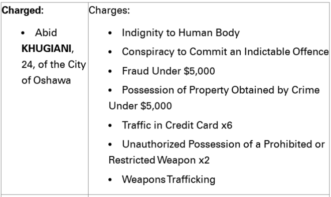 据约克区警方在周二下午发布的通报, 11月27日,调查人员逮捕了一名来自Oshawa的24岁男子Abid KHUGIANI,并提出了与凶杀案有关的多项指控,包括对尸体不敬、诈骗低于5000元、持有犯罪所得低于5000元、持有违禁武器、合谋等。