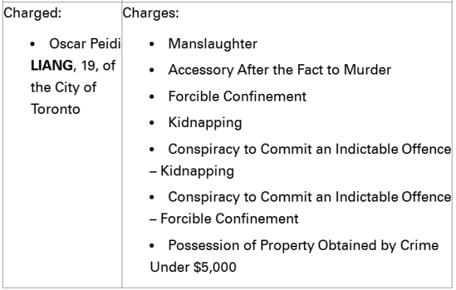 12月4日,调查人员又逮捕了来自多伦多的19岁男子Oscar LIANG,他被控包括过失杀人、绑架、强行禁锢、合谋、持有犯罪所得低于5000元在内的多项罪名。
