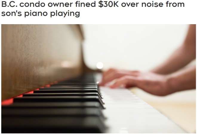 根据民事解决法庭的裁决,一名BC省的华人女子因儿子在自家公寓内练习钢琴而被指违反噪音法规, 被罚款数万加元。