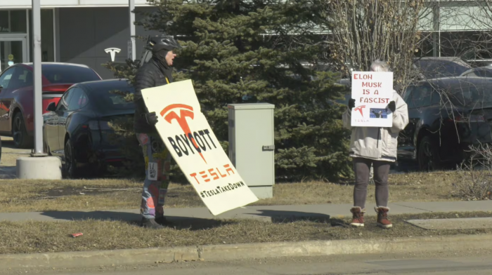 周六,他和几个人聚集在位于 111 大道的埃德蒙顿特斯拉经销店外,声援美国特斯拉拆车运动(Tesla takedown)。