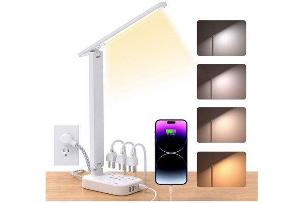 这款多功能LED护眼台灯集插线板、USB充电站和护眼照明于一体,内置2个USB-C和2个USB-A接口,外加3个AC插座,轻松满足多种设备充电需求。