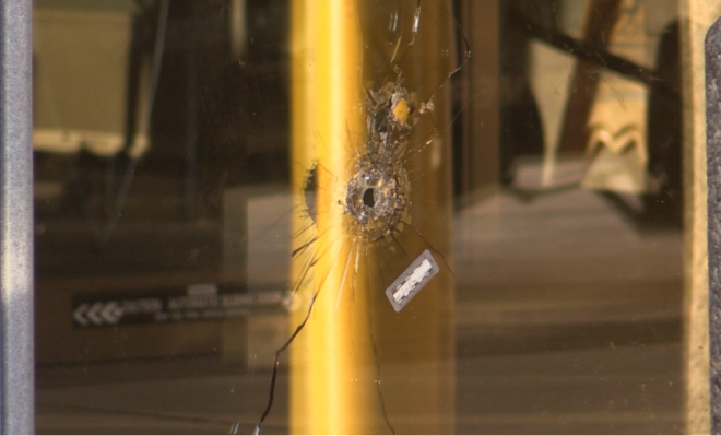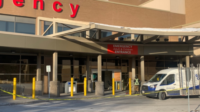 周六凌晨,安省伦敦LHSC维多利亚医院外发生枪击事件,急诊科(ED)入口处的玻璃门上有多个弹孔。
